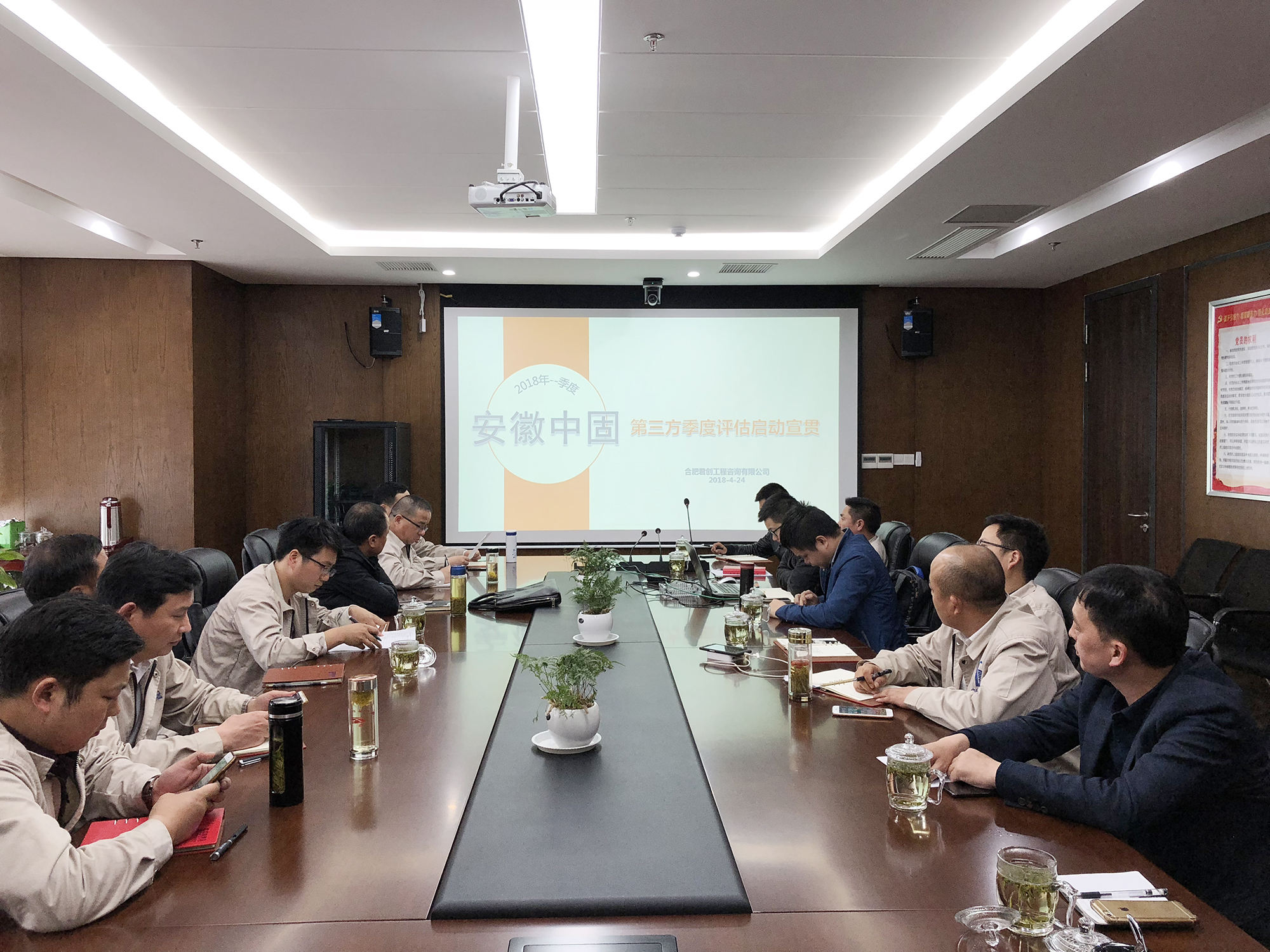 2018年4月24日,安徽中固建設有限公司引進第三方季度評估啟動會在公司會議室舉行。公司總經理陶征強、常務副總徐華龍、工程副總陸裕國及各部門經理、項目經理等20余人參加了會議。
